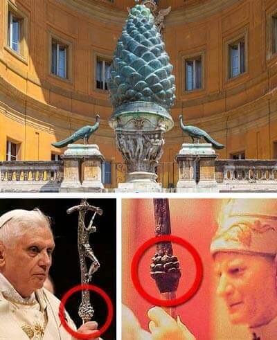 Perhaps the most revealing, is that at the center of the Vatican, one of the most holy sites in the world, sits a giant pine cone shaped statue. And if that wasn't enough to raise some eyebrows, the staff the pope carries with him, also has a pine cone engraved on it as well.